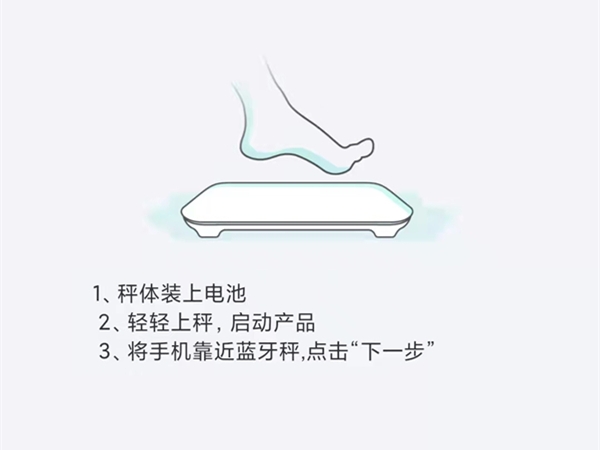 2、将设备装上电池,赤脚上秤启动产品,再将手机靠近秤,点击下一步。