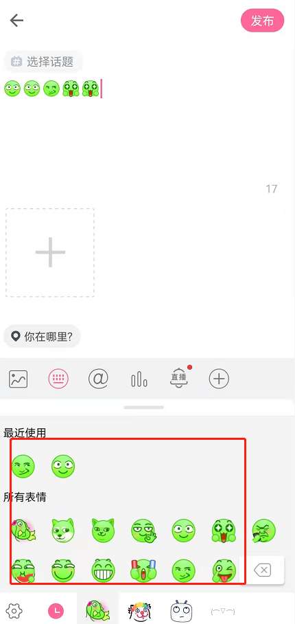 3、可以看到很多绿色的表情,选择后点击发布即可。