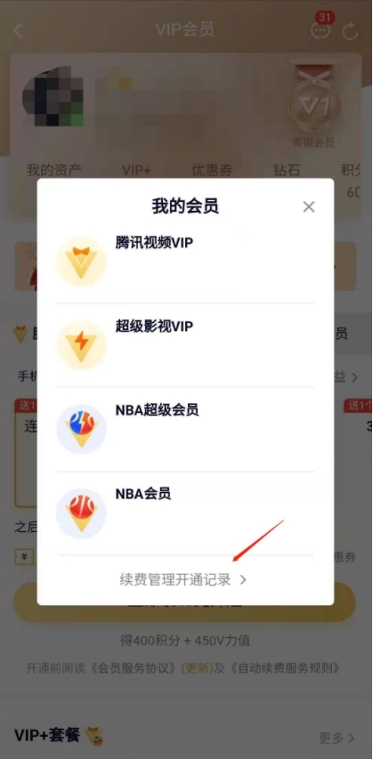 1、在腾讯视频“个人中心”页面点击视频VIP,选择【全部会员与续费管理】。