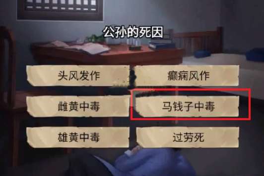 5、第一个问题公孙的死亡时间选择1~2点,第二个问题公孙的死因,马钱子中毒。