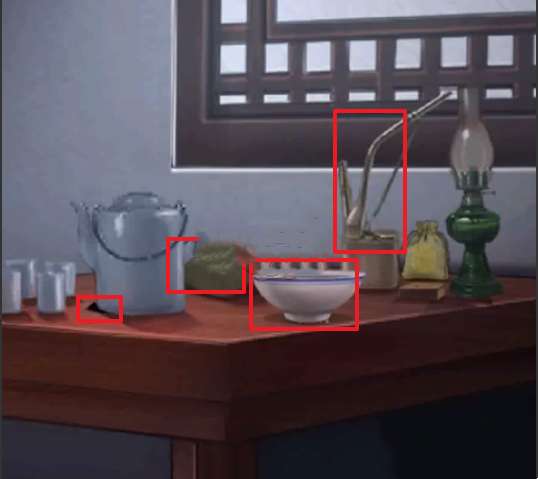 3、点击桌面,如图寻找酒碗,包起来的牛肉,水烟袋,卷起来的黑纸。
