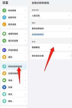 2、找到生物识别和密码,选择智能解锁。