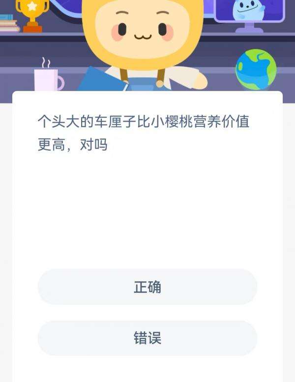 2022支付宝蚂蚁庄园6月28日的题目为:个头大的车厘子比小樱桃营养价值更高对吗?正确还是错误呢?很多小伙伴可能还不太清楚。下面小编就为大家带来了正确答案分享,希望能帮助到你。