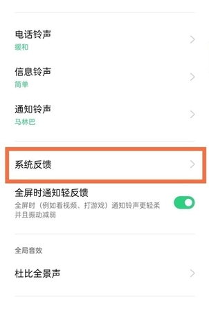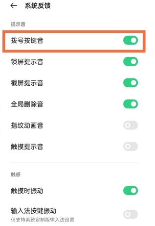 2、点击【系统反馈】,将【拨号按键音】右侧的开关关闭即可。