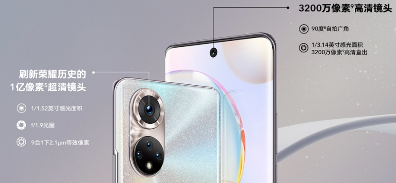 荣耀50:前置3200万像素高清镜头,后置1亿像素超清镜头,内置多镜录像、一拍到底等拍摄效果。