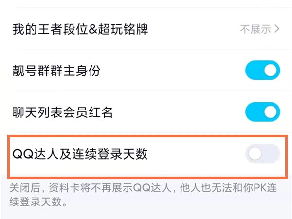 4、将QQ达人及连续登录天数的开关关闭即可。
