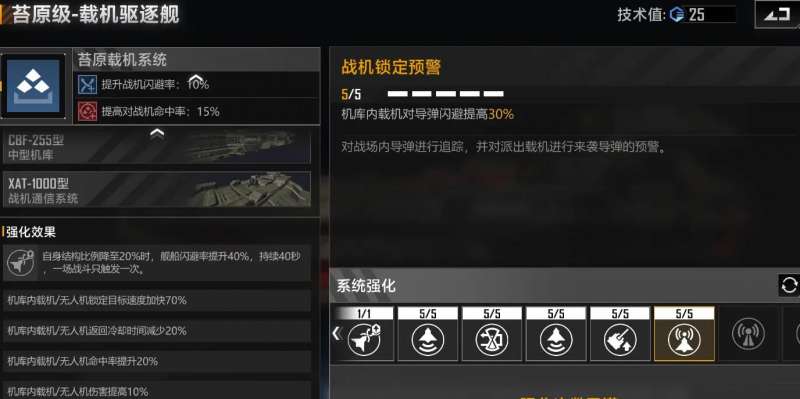 在满级的情况下,其命中率可达到百分之三十。舰船平常情况下拥有百分之十的闪避,在面对导弹时闪避可提升至百分之三十。其护甲过于脆弱,在加点的时候多点装甲与血量,不然那在后排也很容易暴毙。还需要给苔原级的防空大招加点,保证敌方无人机无法飞过来。