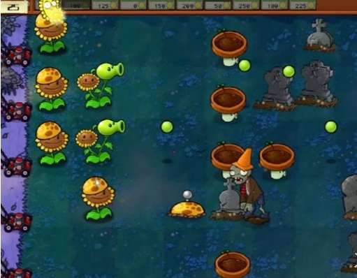 4、在第二波僵尸出现后阳光就充足了,需要摆放两列豌豆向日葵,在小盆菇的位置上放一列双发仙人掌和火炬坚果用来输出。