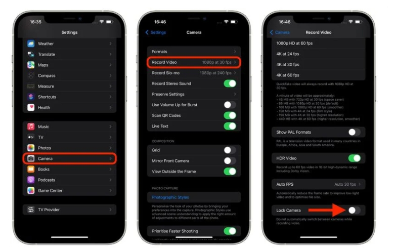 打开手机【设置】-找到【相机】选项进入-然后在【录制视频】中-点击【锁定相机】即可。