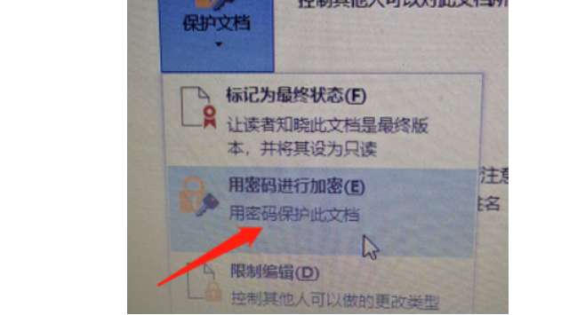 4、点击【保护文档】后,选择【用密码进行加密】功能,这是加密文档的核心操作。
