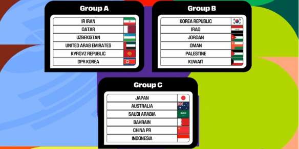 一、分组结果 A组:伊朗、卡塔尔、乌兹别克斯坦、阿联酋、吉尔吉斯斯坦、朝鲜 B组:韩国、伊朗、约旦、阿曼、巴勒斯坦、科威特 C组:日本、澳大利亚、沙特阿拉伯、巴林、