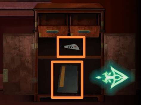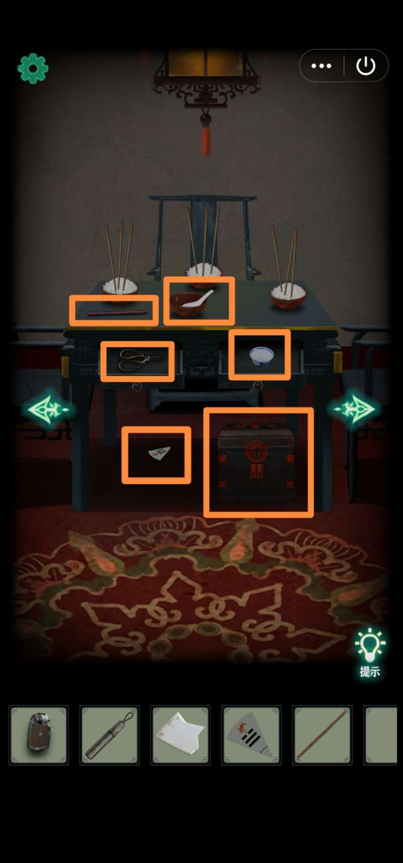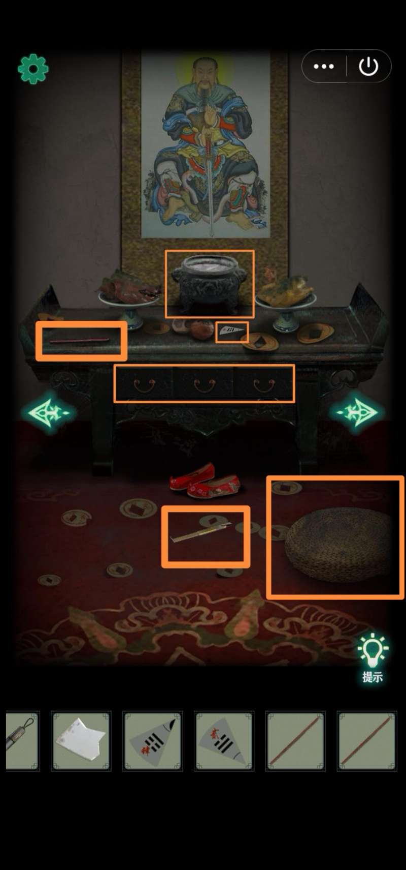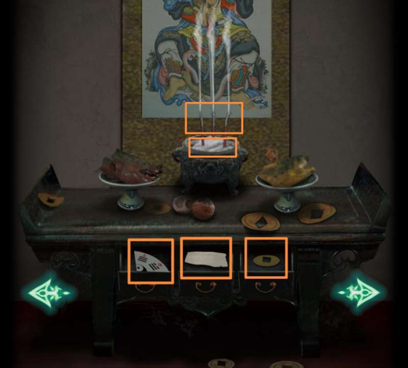 11.右转,桌上拾取【香3】、【八卦图碎片3】。发现供桌抽屉需要找3柱香祭拜(现在就可以插香,应该是bug,毕竟还不知道顺序),出现绣花鞋。移开地上坐垫,得【钥匙】