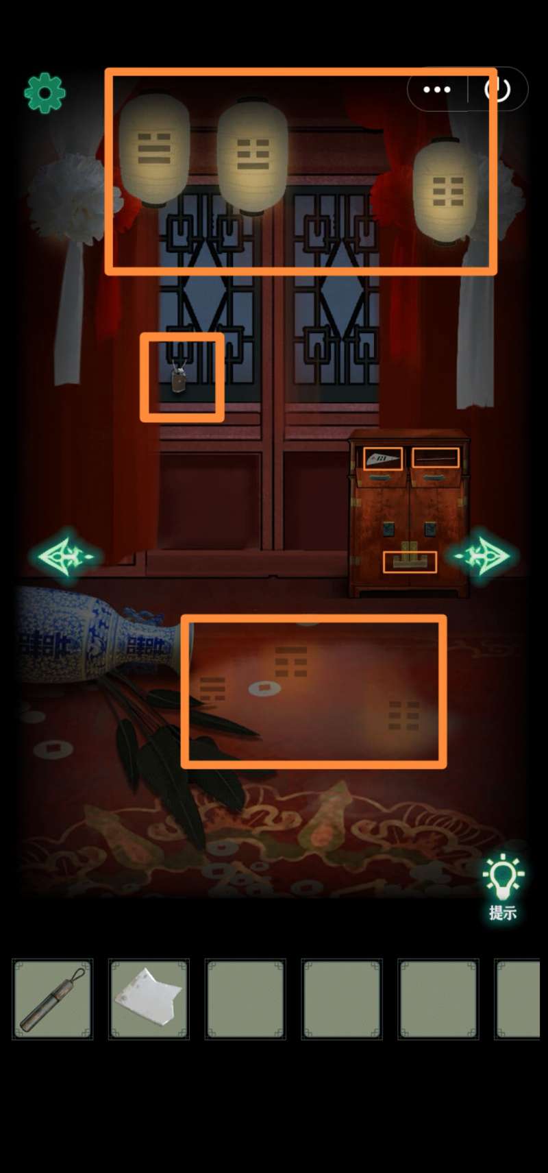 9.左边门上拾取【奇怪的铁片】(容易点出门,点准一点)。从左往右从上到下观察灯笼和地上倒影的6个八卦符号,发现下方柜子需要钥匙开锁。打开上方两个抽屉,得【八卦图碎片1】(容易点出门)、【香1】