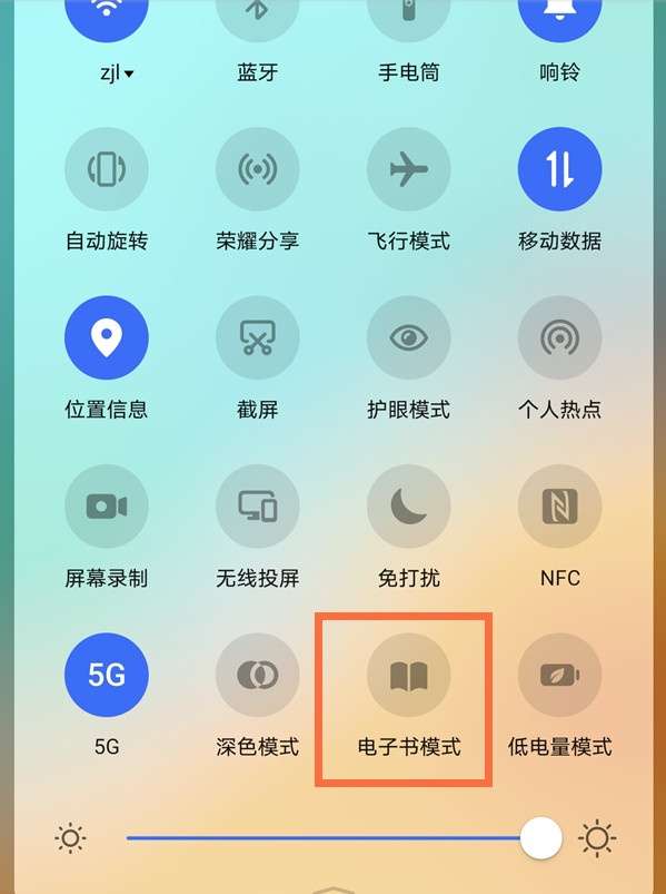 在手机屏幕顶部下滑,找到“电子书模式”并进行开启。