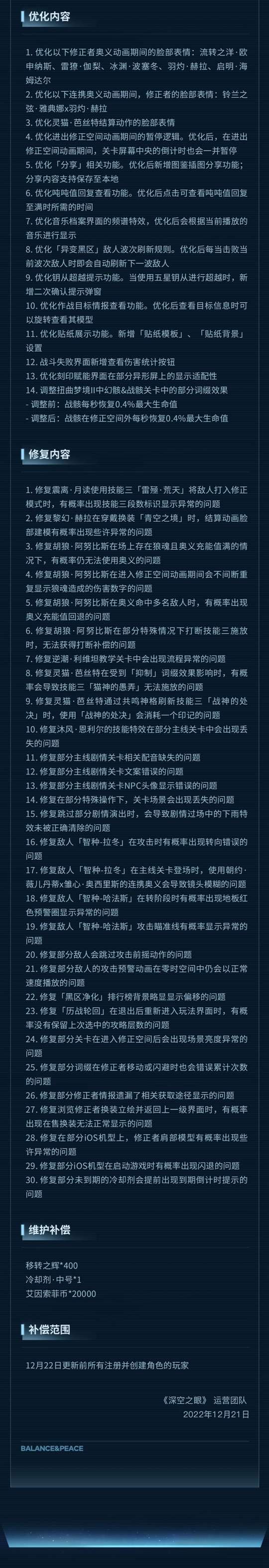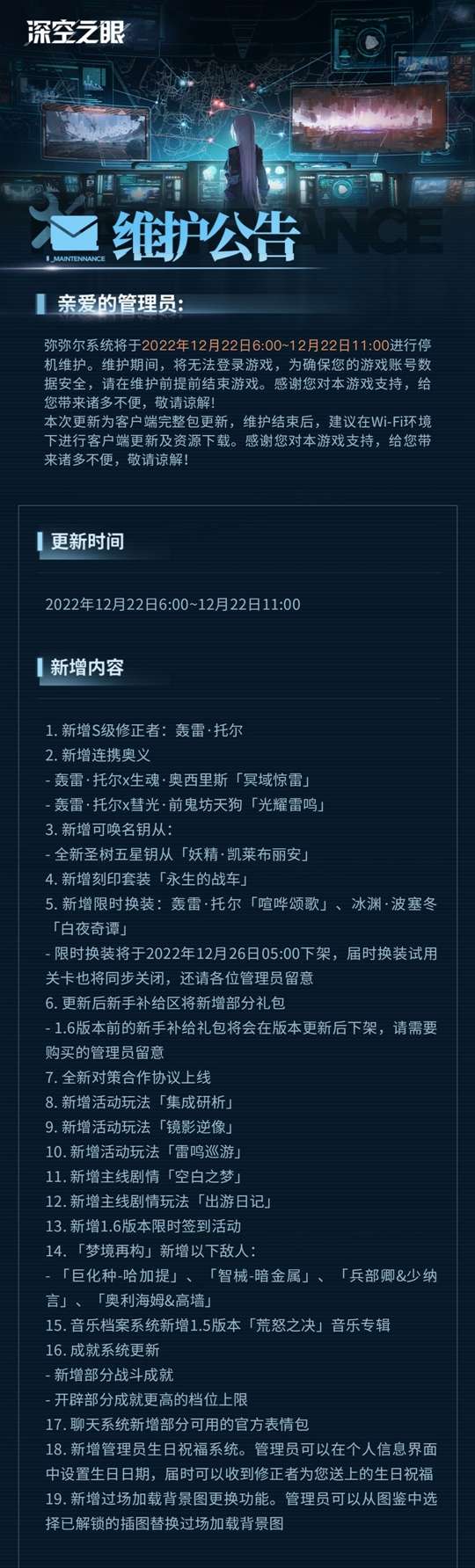 PS:以下是《深空之眼》12月22日停机维护公告的内容详情: