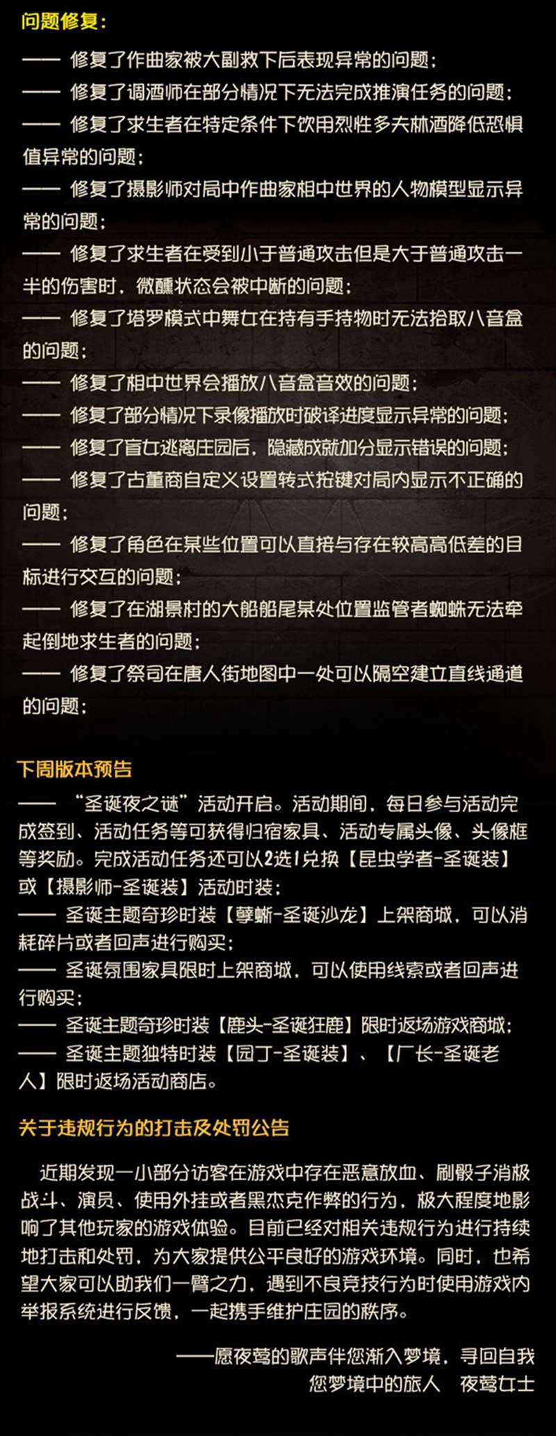 号外,号外,有关第五人格维护公告你可不要错过啦。如果各位小伙伴们还不了解12月8日更新公告的具体内容,那还请大家跟随小编的脚步,一同往下一览更多的更新详情哟。