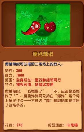 以上就是植物大战僵尸杂交版樱桃辣椒介绍的全部内容了,希望这些内容能对大家有所帮助,好啦,今天的分享就到这了,想要获取更多资讯,就持续关注本站吧!