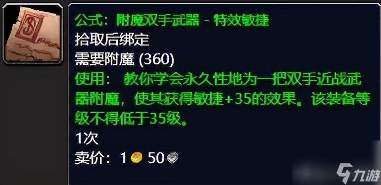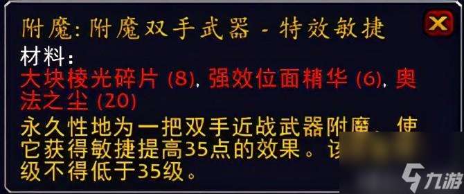 虽然禁魔监狱真的着实让玩家胆战心惊,但是作为一名附魔大师的你必须要欣然前往,毕竟这款经典的附魔可以说是你前期必备的图纸之一了,35点的敏捷加持堪称恐怖,对于敏捷热衷的职业来说必然会花重金请你给他心爱的武器附魔上去这超高的敏捷属性,经典图纸你值得拥有,推荐指数满天星辰。