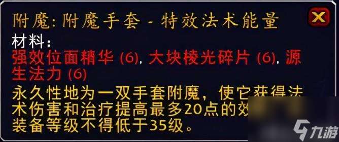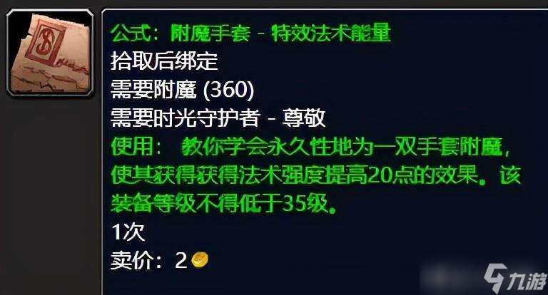 相比较于精确打击的崇敬获取,这款来自于时光守护者声望尊敬就可以拥有的手套特效法术能量附魔图纸绝对是高性价比的附魔了,不要你崇拜,也不要你崇敬,只要尊敬即可拥有,它的优秀我想附魔大师都应该懂,玩家必备好吧,推荐指数满天星辰直戳天花板。