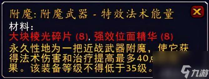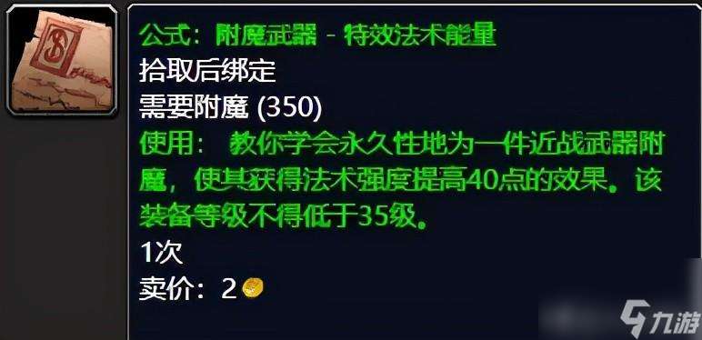 这款出自于刀锋山巴什伊尔码头的附魔图纸公式:附魔武器 - 特效法术能量绝对是前期最为吸金的一张了,而且掉落的机率也是高达2%,相比较于那些所谓的百分之零点几的东西已然高出不少,其实这款附魔法系玩家是最为喜欢的,原因很简单因为成本的话相对来说是非常的低的,性价比却是出奇的高,只要8个大块棱光碎片和8个强效位面精华你就可以拥有40点的法术伤害或者是法术治疗提高堪称恐怖如斯四个大字,如果你是一名专业的附魔地精玩家,我想在TBC开放之后你是肯定不会错过那么一张极品图纸的,推荐指数满天星辰直戳天花板。