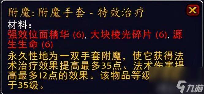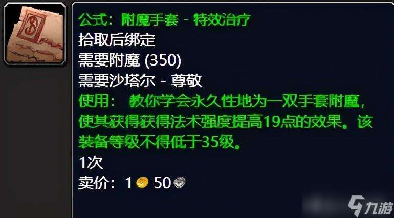 公式:附魔手套 - 特效治疗系沙塔尔声望尊敬购入。