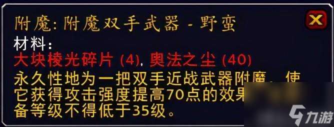 这款附魔双手武器野蛮可以说是前期绝对的性价比史诗级的附魔属性了,相比较于猫鼬而言的话,它的经典之处在于它的材料上面,就猫鼬那堪称恐怖的6颗虚空水晶才能附魔一次来说在前期来时真的太过于奢侈了,前期基本上没有人会变成一个小可爱来大批量分解我们的紫色装备吧,而就我们的大块棱光碎片和奥法之尘而言产出的话还是挺高的,所以前期对于我们的战士玩家亦或者说是惩戒骑玩家来说武器附魔这款野蛮是最为急切以及值得的了,经典双手武器附魔野蛮你值得拥有,推荐指数满天星辰直戳天花板。