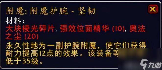 对于前期T玩家来说护腕的12耐力堪称极品了,是别的附魔属性无法替代的。所以对于副本掉落的这款附魔来说只要你经常去必然会拥有的,推荐指数满天星辰。