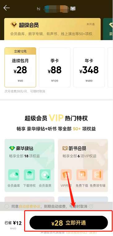 4、最后点击立即开通支付即可。(QQ 音乐“超级会员”服务价格为连续包月 28 元、1 个月 40 元、3 个月 88 元、12 个月 348 元,首次开通可以减少一定金额。)