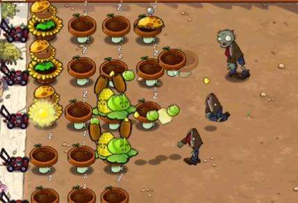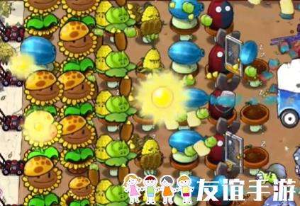 2、在最左侧种植一列向日葵花盆和阳光向日葵,在第三列中间种植两个玉米卷香蒲。