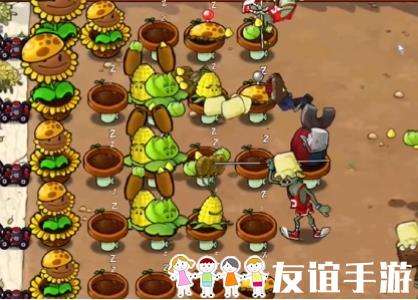 3、在中间一列补充玉米卷香蒲,在最右侧提前种植几个阳光土豆雷。