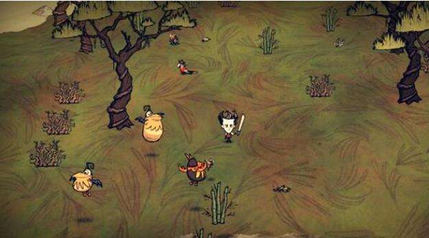 而在胡萝卜的附近,有一定概率会刷新出兔子洞,作为游戏前期小肉的主要来源之一,是补充体力的优质食物。特别是当玩家选择了薇格弗德时,就只能捕捉兔子进行食用了。前期阶段受到资源和材料的限制,我们只能依靠手中的胡萝卜来吸引兔子,等到兔子进食的时候,就可以将其击杀。后期有了科研装置之后,便可以通过制作陷阱来捕杀兔子,效率更高,而且不需要自己本人蹲守。除了兔子之外,火鸡也是一种优质的小肉来源,它们平时会藏在灌木丛中,玩家在采集浆果的时候,有概率会将它们吓出来。火鸡自身移速极高,想要硬追,基本上是不可能的,只能用浆果吸引,然后击杀。值得注意的是,在夜晚即将到来的时候,火鸡会进入休眠状态,此时无论去哪里采集浆果,都不会出现火鸡。火鸡掉落的击退可以和小肉浆果进行烹饪,最后合成火鸡大餐,为玩家回复多种属性,算是前期性价比最高的食物了。