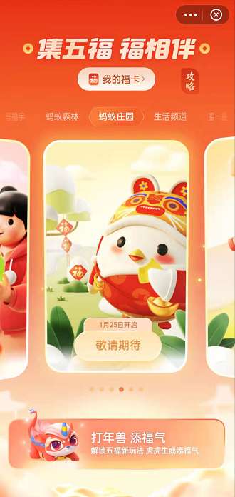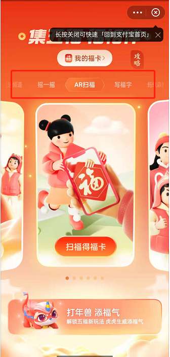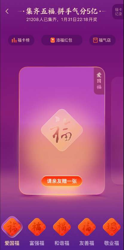 1、可通过在支付宝 App 参与 AR 扫福、写福字、蚂蚁森林、蚂蚁庄园、摇一摇、看“支付宝生活频道”、通过线下扫码进入商家支付宝小程序、及在支付宝合作方渠道参与集五福联名活动等方式集福卡。