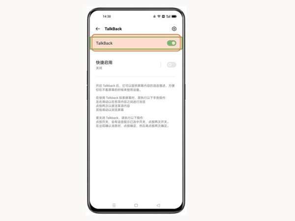 1、在TalkBack界面,找到开关,等该开关外围显示为绿色,然后点按两次开关。