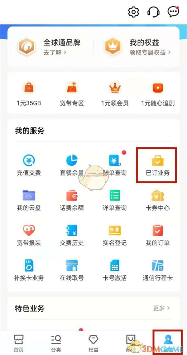 1、打开中国移动app,点击右下我的,点击已订业务。