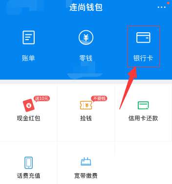 4、随后,进入到钱包后,找到功能区域的“银行卡”,确认“添加银行卡”。