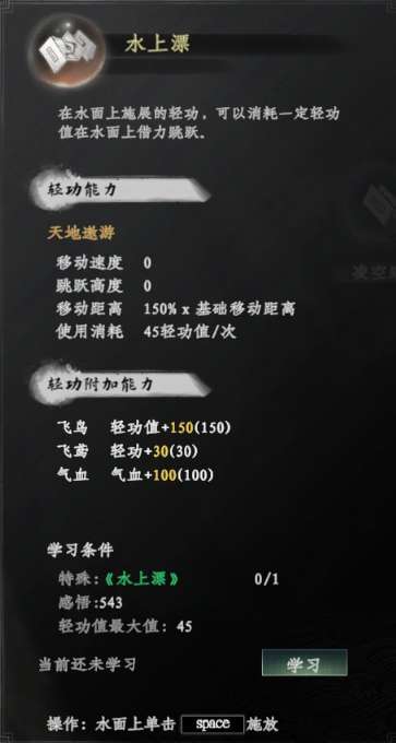 学习条件:水上漂秘籍*1,感悟543,轻功值最大值45