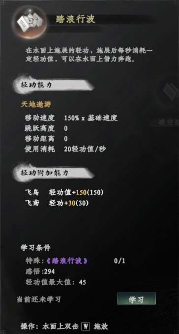 学习条件:踏浪行波秘籍*1,感悟294,轻功值最大值45