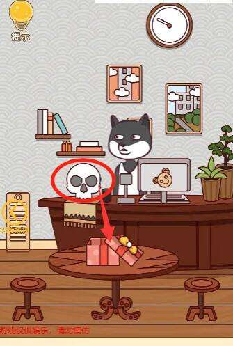 1、切换到右边场景,拿到放在桌子上面的骷髅头,把骷髅头放到礼盒里面