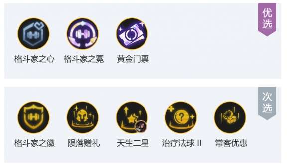 格斗转职基本上是最优先的,确保七级能开出六斗;黄金门票、常客优惠、天生二星基本上开局来都可以拿;陨落赠礼、治疗发球、珠光莲华这三个都属于这个阵容的顶级战力海克斯,3-2或4-2来都可以无脑拿。