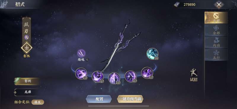 然后是内功搭配:内功选唯我独尊功,白首,霸明功,一件破光阴,神照经,可以输出最大化,这些都是增加双刃输出的内功,可以在打云峰和篝火时使用。