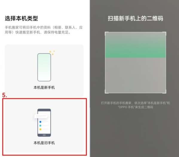 4、在旧手机上点击本机是旧手机,就会出现扫码界面,用旧手机扫描新手机上的二维码,连接后正式进入搬家界面。