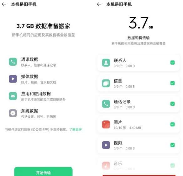 5、勾选需要传输的数据类型,选好之后点击开始传输,输入隐私密码(一般为锁屏数字密码),等待搬家完成即可。