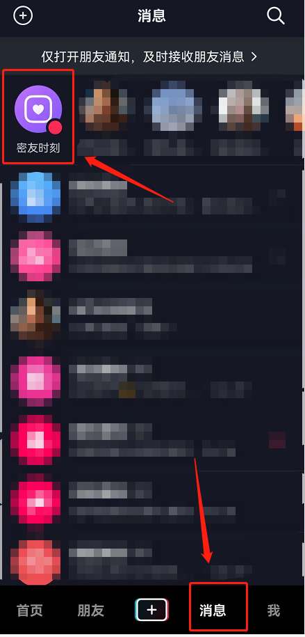 1、打开抖音消息页面,上方最左侧就是密友时刻,点击进入。