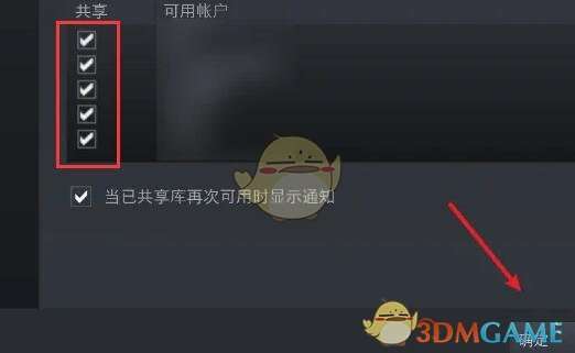 4、只是要取消某一个共享账号的话,就在下面的账户中找到它,取消勾选它并“确定”保存即可。