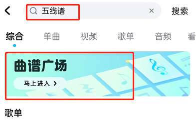 1、首先,在酷狗音乐,直接搜索五线谱/曲谱。点击进入曲谱广场。