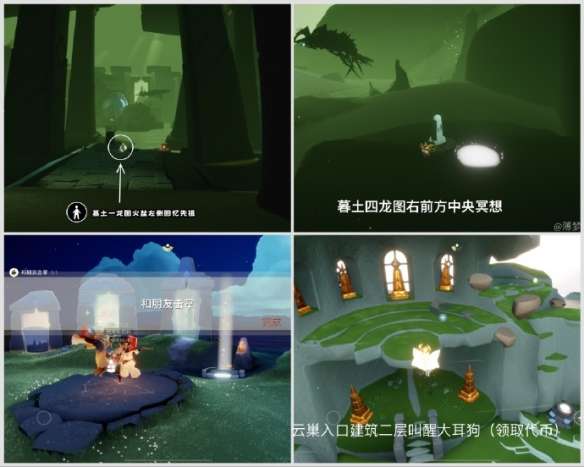 云巢入口建筑二层 叫醒大耳狗 【任务④】在巨兽荒原的神坛旁冥想:在墓土四龙图最右侧中央冥想即可完成!
