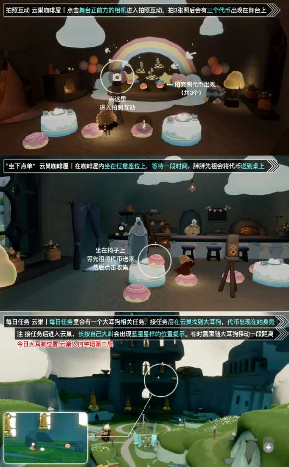 1.今日任务 【任务①】和朋友击掌 【任务②】在墓土重温先祖的美好回忆:在墓土一龙图正前方火盆旁点燃先祖进行回忆即可完成! 【任务③】在云巢叫醒大耳狗: