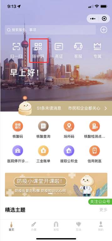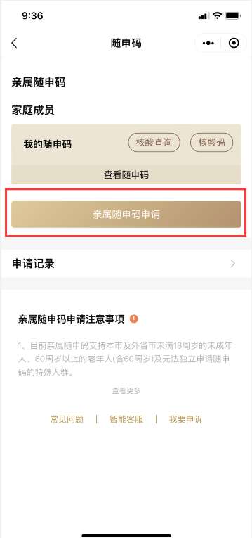 5、如果之前没有领取过亲属随身码,可以点击亲属随身码申请,通过后就可以领取亲属核酸码了。