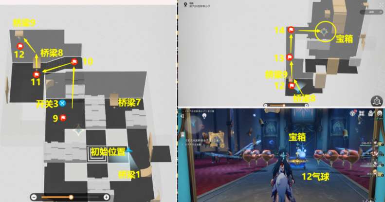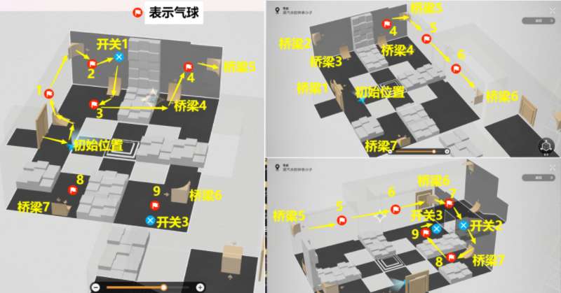 4、难度3副本解密:按照【桥梁1】到【桥梁9】路线,打掉路上遇到的14个气球和打开路上遇到的3个开关,开了最后的宝箱后(开宝箱前先将宝箱周围12个气球打掉),该副本结束;