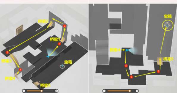 2、难度1副本解密:按照【桥梁1】到【桥梁5】路线,打掉路上遇到的7个气球,开了最后的宝箱后,该副本结束;